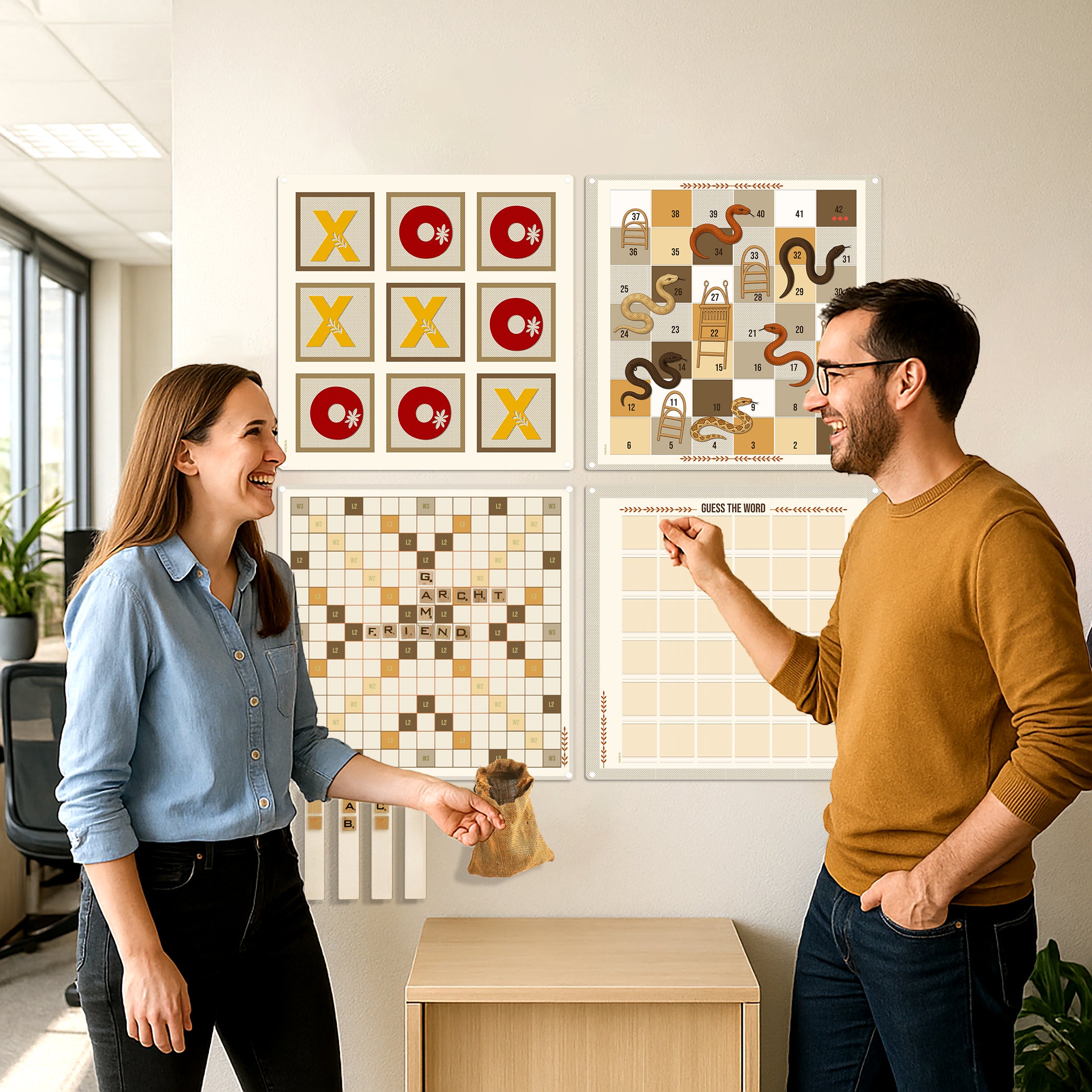 Test your word-guessing skills with this sleek and modern wall game! Designed with durable metal, this interactive game challenges your vocabulary while providing a fun and engaging experience. Place the letters to uncover the hidden word, receiving hints with each attempt to get closer to the solution. With its aesthetic design, it remains a decorative piece on your wall even when not in use. Perfect for homes, offices, or social spaces, this game offers a unique experience whether you play solo or compete with friends!